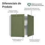 O acabamento de alta resistência da estrutura é em Branco e das frentes em Verde . Possui uma textura suave ao toque, trazendo leveza e sofisticação ao ambiente. O destaque vai para os puxadores ponto em ouro envelhecido, feitos com metal resistente, que adicionam personalidade e um charme único. Outro diferencial está no detalhe chanfrado das frentes, que forma molduras elegantes e dá profundidade ao design, refletindo o estilo americano com um toque moderno.