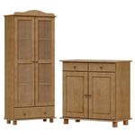 Armário Cristaleira e Balcão, um conjunto projetado para quem busca móveis que combinam elegância e funcionalidade para complementar sua decoração. Produzido em madeira maciça de pinus de reflorestamento, sua estrutura robusta garante durabilidade e resistência. O Armário Cristaleira conta com 02 portas de vidro incolor e 01 gaveta, e o Balcão com 02 portas e 02 gavetas. As portas possuem dobradiças com amortecimento, e as gavetas corrediças telescópicas, que proporcionam abertura suave e silenciosa. Com pintura acetinada com verniz PU e UV, que realça a beleza natural da madeira enquanto protege contra desgastes do dia a dia e puxadores metálicos que adicionam um toque moderno ao design clássico do produto. Os pés torneados em madeira maciça garantem estabilidade e charme artesanal. Oferecem amplo espaço interno, perfeitos para organizar louças, objetos decorativos ou itens de sua preferência. Estes móveis chegarão em sua casa separados em 03 volumes.
