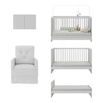 O Berço 3 em 1 com Colchão Poltrona e Armário Aéreo 2 Portas Multimóveis MP4156 é perfeito para proporcionar conforto ao seu pequeno. O berço e o armário aéreo são produzidos em MDP com acabamento acetinado (cerca de 20% de brilho), garantindo durabilidade e resistência. O berço é padrão (tamanho do colchão 1,30 x 0,60), se transforma em sofá e minicama, acompanhando o crescimento do seu filho, possui 3 regulagens de altura para o colchão e acompanha suporte para mosquiteiro, garantindo noites mais tranquilas de sono para o bebê. As grades em MDF/madeira maciça de pinus garantem maior estabilidade e segurança para o bebê. Selo de certificação do INMETRO: 0000085/2018. Acompanha colchão (suporta até 50kg) em espuma revestido com tecido poliéster, que possui conforto macio e tratamento anti-ácaro e anti-alérgico. A poltrona de amamentação (suporta até 110kg) é produzida em madeira de eucalipto e espuma densidade D23 com molas reforçadas e mecanismo de balanço. As poltronas nas cores cinza e bege possuem acabamento em tecido veludo. Poltrona na cor branca possui acabamento em material sintético. O armário aéreo possui 2 portas e suporta até 6kg em seu interior.