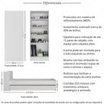 Com design minimalista e funcional, a sapateira oferece 4 prateleiras, sendo 2 fixas e 2 ajustáveis, cada uma com capacidade para até 6kg, além de espaço para calçados altos. Espaçosa, comporta até 15 pares de calçados e sua porta pode ser instalada de acordo com sua preferência (à esquerda ou à direita). O puxador discreto em ABS é moderno e prático de manusear.