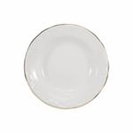 Uso: Não pode ser levado ao micro-ondas e na lava-louçasMaterial: PorcelanaFormato: RedondoDecoração: Liso com relevo nas bordas e filete em tinta ouroCor: Branco