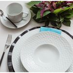 Uso: Resistente a micro-ondas, resistente a lava-louçasMaterial: PorcelanaFormato: RedondoDecoração: Liso com relevo nas bordas e efeito peroladoCor: Branco