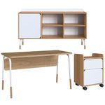 Conjunto Escritório 3 Peças 988X995X998, foram inspirados no design orgânico e estilo contemporâneo, transformando seu ambiente de trabalho em um lugar leve e confortável. Mesa Possui estrutura em MDP, tampo de 25 mm, saia 15 mm, e acabamento em pintura BP (fosco). Composta por amplo tampo com cantos arredondados, seus pés são em tubo de aço com acabamento em epóxi fosco e as extremidades em madeira maciça de eucalipto com sapatas reguláveis. Balcão composto por ampla superfície para disposição de objetos, porta com dobradiças metálicas com amortecimento, gaveta interna com corrediças telescópicas, 2 nichos com prateleira removível para guardar acessórios tornando o espaço mais funcional, pés em tubo de aço com acabamento em pintura epóxi fosca, extremidades dos pés em madeira maciça de eucalipto com sapatas reguláveis. Gaveteiro com 2 gavetas com corrediças telescópicas para melhor organização, além de rodízios em nylon sendo 2 com trava e 2 sem trava ajudando a praticidade do local. Estes móveis chegarão na sua casa separados em 3 volumes.