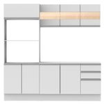 - Itens inclusos: Uma (1) torre quente de 70cm com nichos para forno e micro-ondas com três (3) portas, sendo uma (1) basculante | Um (1) balcão inferior de 120cm com três (3) portas, duas (2) gavetas e tampo | Um (1) aéreo de 120cm com três (3) portas e detalhe em vidro