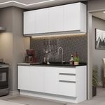 O acabamento da cozinha é branco, feito em Pintura Poliéster ecológica, com aplicação de 7 camadas de proteção resistentes a álcool, água e calor.