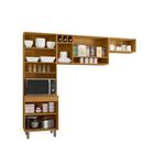 O paneleiro duplo de altura diferenciada (218 cm) possui 4 portas de bater com dobradiças metálicas de 26mm, prateleiras internas e nicho para micro-ondas (A: 42 x L: 65 x P: 50 cm), perfeito para o dia a dia. O aéreo de 120cm inclui 3 portas, nicho decorativo (A: 23,5 x L: 65 x P: 18 cm) e adega para 3 garrafas, combinando charme e utilidade.