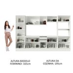 As medidas totais são: 300 cm de largura e 195 cm de altura; profundidade de 47 cm nos balcões e paneleiro e de 27 cm nos aéreos.
