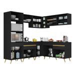 Altura: 203cm | Largura: 222 x 172cm | Profundidade: 32cm (aéreos) - 53cm (balcão com tampo e paneleiro)