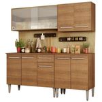 - Itens inclusos: Um Armário Aéreo com duas portas em vidro e dois nichos internos | Um Balcão com três portas, uma gaveta e tampo | Um Armário Aéreo com uma prateleira interna e duas portas | Um Balcão com duas portas e tampo