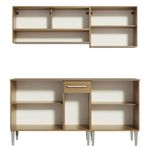 - Itens inclusos: Um Armário aéreo com duas portas de correr de vidro reflex e um nicho | Um Armário aéreo com duas portas | Um Balcão com duas portas e tampo | Um Balcão com três portas, uma gaveta e tampo