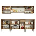 - Itens inclusos: Dois Armários Aéreos com duas portas cada | Dois Balcões com duas portas e um tampo cada | Um Balcão com três portas, uma gaveta e tampo | Um Armário Aéreo com duas portas de correr de vidro