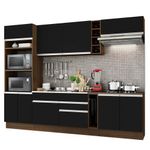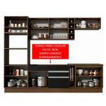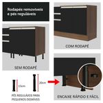 Outro grande diferencial desta cozinha é a profundidade maior, como uma cozinha planejada: 52 cm no balcão inferior e 31 cm nos aéreos. As medidas totais são: 290 cm de largura e 225 cm de altura.O balcão de pia comporta pias de 120 cm x 52 cm. Já o balcão para cooktop segue com tampo de 80 cm x 52 cm que pode ser recortado para a colocação do cooktop. Possui também pés reguláveis e rodapé removível.O acabamento da estrutura interna e externa é em amadeirado Rustic. As portas e frentes das gavetas são pretas. As partes internas das gavetas e das costas são brancas. Os processos são feitos em Poliéster Protetor ecológico de alta resistência, que protege o móvel dos efeitos da água, do álcool e do calor.
