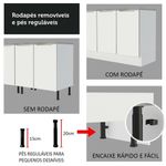 Todos os puxadores são em alumínio, mais resistentes ao uso diário e os pés são reguláveis em PVC, com rodapé removível para facilitar na hora de fazer a limpeza.