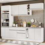 O acabamento da cozinha é branco, feito em Pintura Poliéster ecológica de alta resistência, que protege o móvel dos efeitos da água, do álcool e do calor.