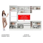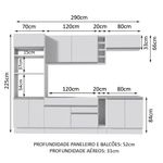 Outro grande diferencial desta cozinha é a profundidade maior, como uma cozinha planejada: 52 cm no balcão inferior e 31 cm nos aéreos. As medidas totais são: 290 cm de largura e 225 cm de altura.