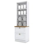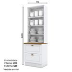 Cristaleira 2 Portas 2 Gav 72cm C357 Americana Branco Nature HennCristaleira 2 Portas e 2 Gavetas 72 cm, cozinha provençal, seu conceito é inspirado nas clássicas cozinhas estilo americano. Estrutura 100% MDF de 15mm (fundo em MDF de 3mm), possui rodapés com opção de instalação sem rodapés suspensa (ferragens para fixação na parede inclusas). Suas 2 portas de vidro equipadas com dobradiças metálicas 35mm com Amortecimento, e suas 2 gavetas com corrediças telescópicas para um deslizar suave e silencioso. Conta com 4 prateleiras cada uma suportando até 8kg. A pintura UV texturizada proporciona um acabamento sofisticado e fácil de limpar. Com tampo de 71,5 x 32,2 cm. Este móvel chegará na sua casa separado em 03 volumes.DimensõesAltura: 220,5 cm