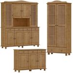 Cristaleira, Armário e Balcão Buffet, um conjunto projetado para quem busca móveis que combinam elegância e funcionalidade para complementar sua decoração. Produzido em madeira maciça de pinus de reflorestamento, sua estrutura robusta garante durabilidade e resistência. A Cristaleira conta com 08 portas, sendo 02 de vidro incolor, e 04 gavetas, o Armário com 02 portas de vidro incolor e 01 gaveta, e o Balcão com 03 portas e 03 gavetas. As portas possuem dobradiças com amortecimento, e as gavetas corrediças telescópicas, que proporcionam abertura suave e silenciosa. Com pintura acetinada com verniz PU e UV, que realça a beleza natural da madeira enquanto protege contra desgastes do dia a dia e puxadores metálicos que adicionam um toque moderno ao design clássico do produto. Os pés torneados em madeira maciça garantem estabilidade charme artesanal. Oferecem amplo espaço interno, perfeitos para organizar louças, objetos decorativos ou itens de sua preferência. Estes móveis chegarão em sua casa separados em 06 volumes.