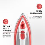 VAPOR CONTÍNUO E SPRAY: O ferro libera alta quantidade de vapor e possibilita remover os amassados das roupas. Além disso, o spray umedecedor é mais um aliado na tarefa e facilita a retirada dos vincos mais difíceis.