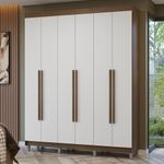 Com acabamento de alta resistência, o móvel garante durabilidade e acabamento impecável. A estrutura e os puxadores em tom amadeirado Rustic, combinados com as portas brancas, criam um visual elegante e moderno. Os puxadores de 80 cm, fabricados em MDF, são um diferencial que destaca o design alongado do móvel. Os pés elevam o guarda-roupa, conferindo estilo e facilitando a limpeza do ambiente.
