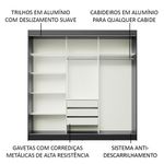 Internamente, são dois cabideiros de alumínio que oferecem espaço para roupas curtas e mais longas, além de diversas prateleiras, nichos e três gavetas espaçosas com corrediças metálicas. Dessa forma, cabe tudo que um casal precisa: calçados, malas, travesseiros, edredons e muito mais.