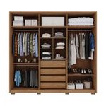 Com varias divisorias o roupeiro possui no centro do movel um espaco colmeia com 6 nichos, reparticoes na parte superior que pode ser utilizadas como maleiro e prateleiras na parte inferior para de melhor agrado