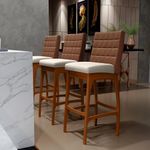 Entregando muita excelência, o Kit 06 Banquetas Altas Cozinha Sala De Jantar Fixa Mila B04 Couríssimo Marrom Linho Cru - Lyam Decor é o complemento que faltava para deixar sua casa ainda mais extraordinária. Seu encosto com costura em padrão quadriculado e assento estofados, centralizam em si uma graciosidade estonteante, sem perder todo o conforto. A estrutura em madeira, na cor nozes, também é digna de notoriedade, por imprimir bastante personalidade a sua decoração. Vale ressaltar ainda, o apoio para os pés que garante maior segurança à banqueta.