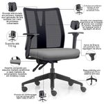 Encosto com mecanismo ergonômico de inclinação, de acordo com o biotipo do usuário, travamento em qualquer ponto e regulagem de altura.