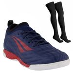 Faça jogadas incríveis em quadra com total conforto junto a Chuteira Futsal Penalty Brasil 70 XXI. Seu cabedal confeccionado em material sintético apresenta superfície texturizada, concedendo maior controle de bola, ampliando a performance em jogo. Traz entressola em EVA, ligando-se ao solado emborrachado com as tecnologias Ultra Grip e Non Marking, fornecendo assim, maior estabilidade e conforto a cada passada, além de entregar total aderência e tração dentro das quadras. Seu fechamento é realizado por cadarços, possuindo o auxílio de colarinho elástico, tornando o ato de calcar mais rápido e prático. As palmilhas removíveis são produzidas em PU, facilitando a higienização da peça. O design predominantemente em marinho, oferece detalhes em vermelho, além, de trazer o solado em cor branca, dando maior destaque a peça. Referência: 124216/6191. Já o meião Penalty Confeccionado com fibras têxteis que combinam elasticidade, toque macio e secagem rápida. Possui faixa tensora para melhor ajuste. Seu punho é canelado e ainda conta com maior compressão e rápida absorção do suor.