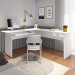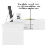 Mesa Escrivaninha De Canto 1 Gaveta 150x165 Cm Branco Arly BrancoA Mesa Escrivaninha foi desenvolvida para garantir praticidade e conforto nas suas atividades diárias, seja no trabalho ou nos estudos. Com estrutura em formato L, produzida em MDF/MDP de 15 mm, 1 gaveta com puxador em plástico ABS e corrediças metálicas, 1 prateleira retrátil para teclado também com corrediças metálicas e pés no formato de sapata esférica em plástico ABS. A mesa suporta até 8 kg (4 kg por tampo), e conta com acabamento em pintura UV texturizada (semi brilho) que proporcionam durabilidade e fácil limpeza. Este móvel chegará em sua casa separado em 01 volume.