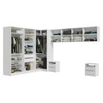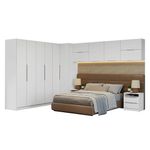 O conjunto é formado por três módulos do guarda-roupa, que oferecem prateleiras, gavetas e cabideiros, garantindo espaço para roupas, calçados e acessórios. Além disso, conta com cinco armários aéreos e duas mesas de cabeceira, que completam o conjunto com praticidade e estilo.