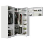 O conjunto é formado por três módulos do guarda-roupa, que oferecem prateleiras, gavetas e cabideiros, garantindo espaço para roupas, calçados e acessórios. Além disso, conta com dois armários aéreos, perfeitos para aproveitar o espaço do quarto e manter tudo sempre bem organizado.