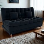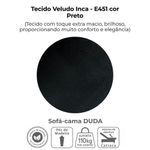 Sofa Cama 2 Lugares 185 Cm Duda Veludo Inca E451 Milani Store PretoEstilo acolhedor e funcionalidade em todos os aspectos: Sofá-Cama Duda! Sua estrutura é feita 100% em madeira de Eucalipto de reflorestamento, com reforço de cintas elásticas e molas espirais. Os assentos e encostos contam com espuma D20 Soft, já o revestimento em tecido Veludo Inca (um tecido com toque extra macio, brilho sofisticado e visual elegante) entrega charme e aconchego. O sistema de abertura é tipo catraca e permite 3 posições: Sentado (modo sofá tradicional), Leitura (encosto levemente inclinado) e Descanso (modo cama). Suporta até 110 kg por assento e acompanha 2 almofadas decorativas (55x35 cm). Os pés em madeira completam o design moderno. Este móvel chegará em sua casa separado em 01 volume.DimensõesMedidas Sentado: