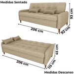 Conforto que se destaca com visual clean: o Sofá-Cama Donna é a definição de curvas suaves e toque moderno! Sua estrutura é feita 100% em madeira de Eucalipto de reflorestamento, com reforço de cintas elásticas e molas espirais, garantindo resistência e durabilidade. Os assentos e encostos são compostos por espuma D26, enquanto as braças utilizam espuma D23, proporcionando conforto extra em todos os pontos. O revestimento é em tecido Vancouver Linen (Linho misto: resistente, levemente texturizado e com visual contemporâneo). As bordas arredondadas e os pés em madeira completam o design com um toque atual. Já o sistema de abertura tipo catraca permite 3 posições de uso: Sentado (modo sofá), Leitura (encosto inclinado) e Descanso (modo cama). Suporta até 110 kg por assento e acompanha 2 almofadas decorativas (55x35 cm). Este móvel será entregue em sua casa separado em 01 volume.DimensõesMedidas Sentado: