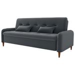 Sofa Cama 2 Lugares 206cm Donna Veludo E425 Milani Store CinzaConforto que se destaca com visual clean: Sofá Cama Donna é a definição de curvas suaves e toque moderno! Sua estrutura é feita 100% em madeira de Eucalipto de reflorestamento, reforçada com cintas elásticas e molas espirais. Os assentos e encostos são compostos por espuma D26, enquanto as braças utilizam espuma D23. O revestimento fica por conta do tecido Veludo (toque aveludado, brilho elegante e visual clássico), que abraça o ambiente com estilo. As bordas arredondadas e os pés de madeira completam o design com um toque contemporâneo. Já o sistema de abertura tipo catraca permite três posições de uso: Sentado (modo sofá tradicional), Leitura (encosto levemente inclinado) e Descanso (modo cama). Suporta até 110 kg por assento e acompanha 2 almofadas decorativas (55x35cm). Este móvel chegará em sua casa separado em 01 volume.DimensõesMedidas Sentado: